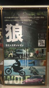 映画「狼 ラストスタントマン」。新宿武蔵野館に特大バナーとエレベーター・ラッピングが登場しました!ぜひご覧ください!