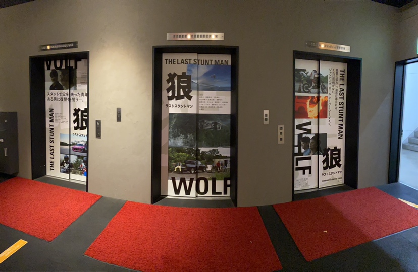 映画「狼 ラストスタントマン」。新宿武蔵野館に特大バナーとエレベーター・ラッピングが登場しました!ぜひご覧ください!