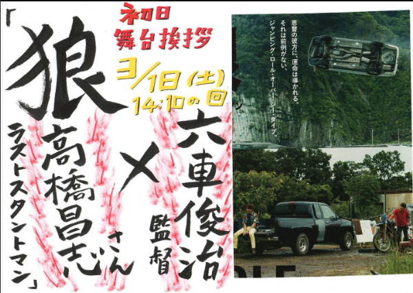 「狼 ラストスタントマン」名古屋シネマスコーレ3/18(土)舞台挨拶決定! 2023年3月15日 最終更新日時 : 2023年3月15日 rokkasenfilms 「狼 ラストスタントマン」名古屋のシネマスコーレにて、3/18(土)14:10の回、上映後に初日舞台挨拶を行います!登壇者は高橋魔さん、六車俊治監督です。名古屋近隣のお住まいの方はぜひご来場くださいませ! FacebooktwitterHatenaPocketCopy